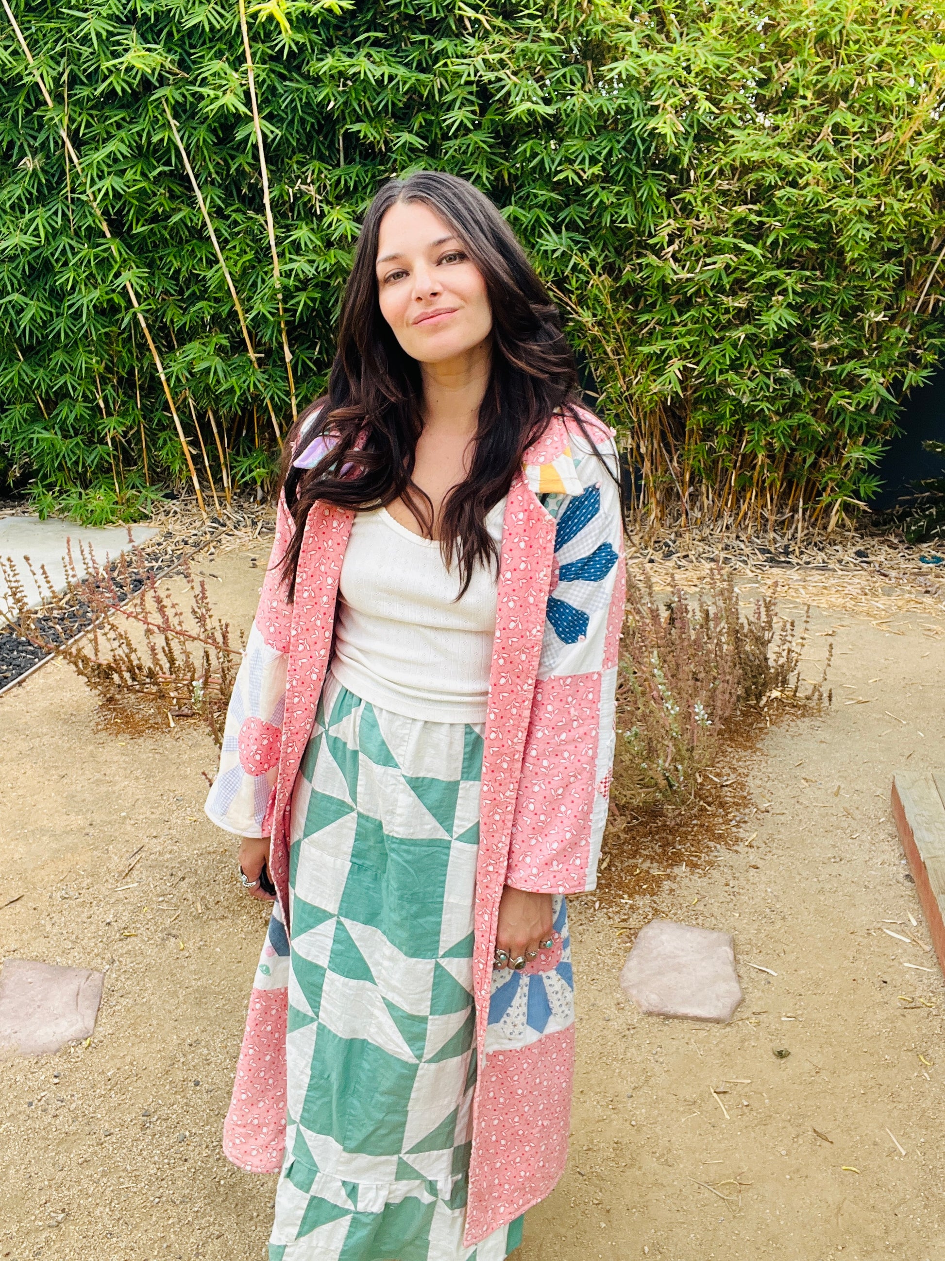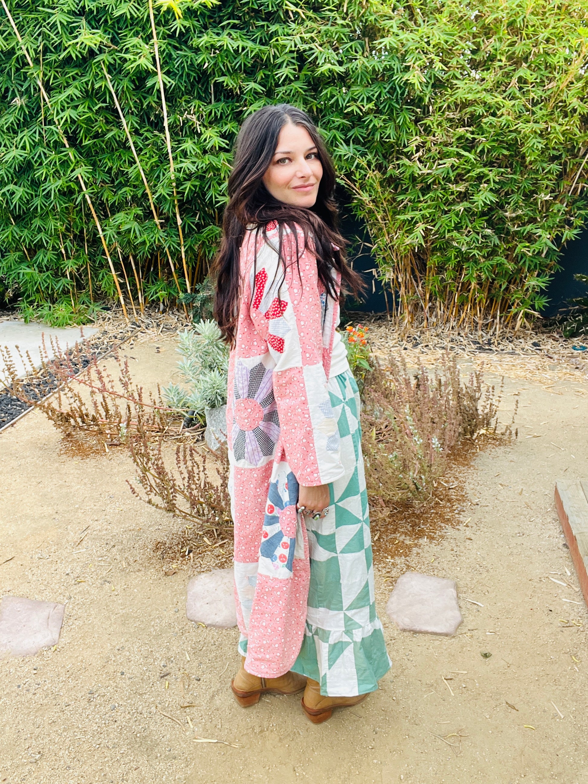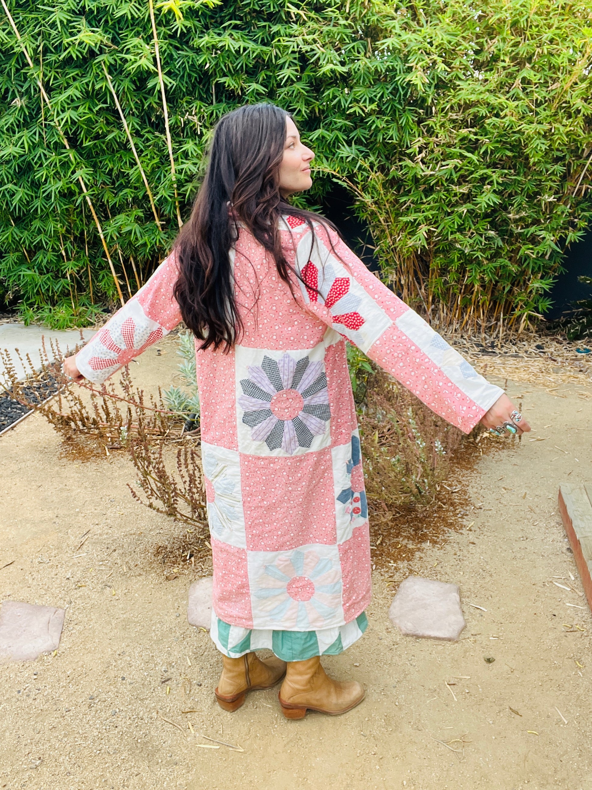 Handmade from a true 1940s quilt, this one-of-a-kind duster tells its story through soft pink feedsack florals, blooming Dresden plates, and sun-faded patchwork blues and greens. The weight and texture speak to decades of love and care — now reimagined into a wearable heirloom by Milk Thistle Sewing.