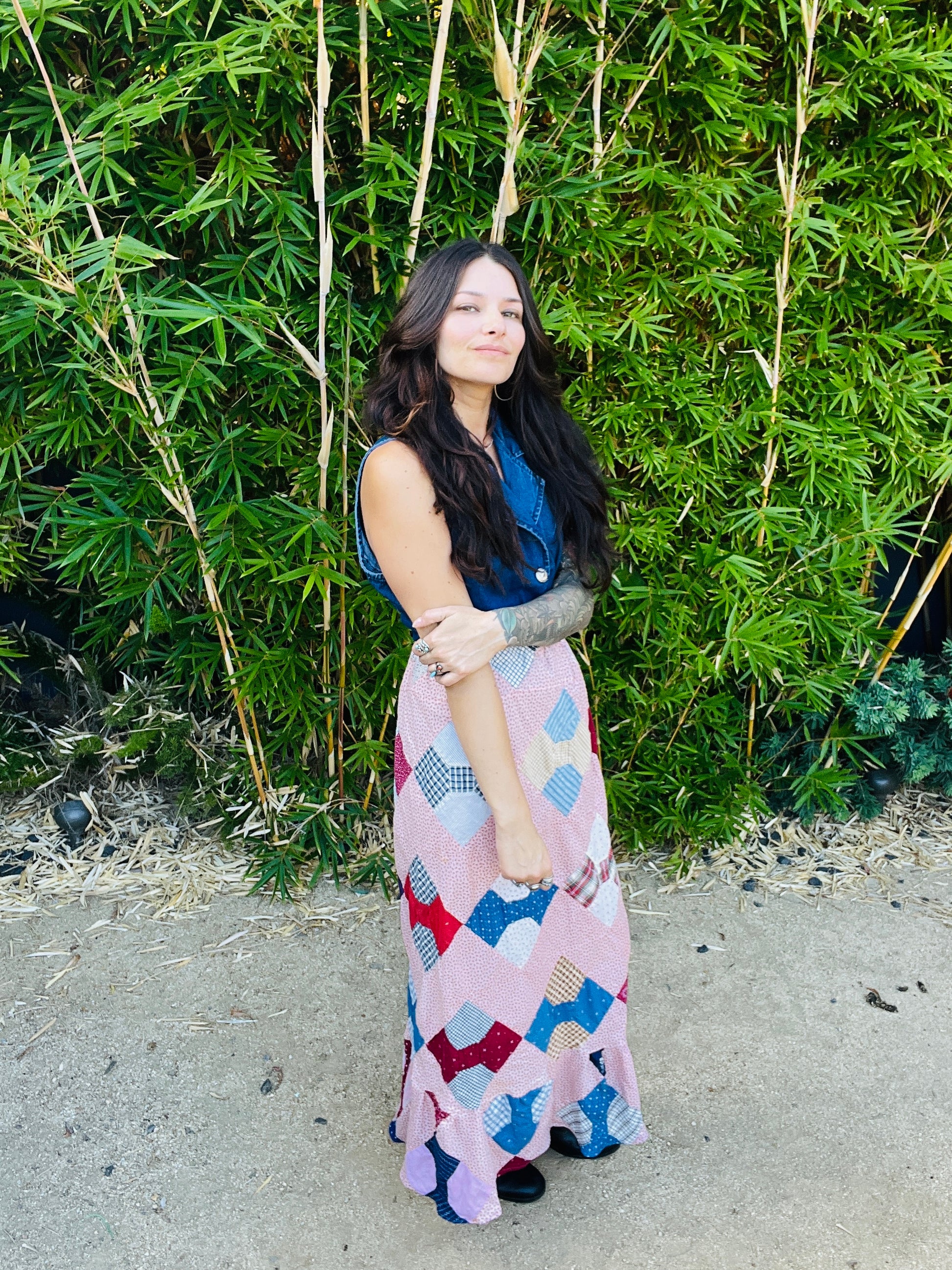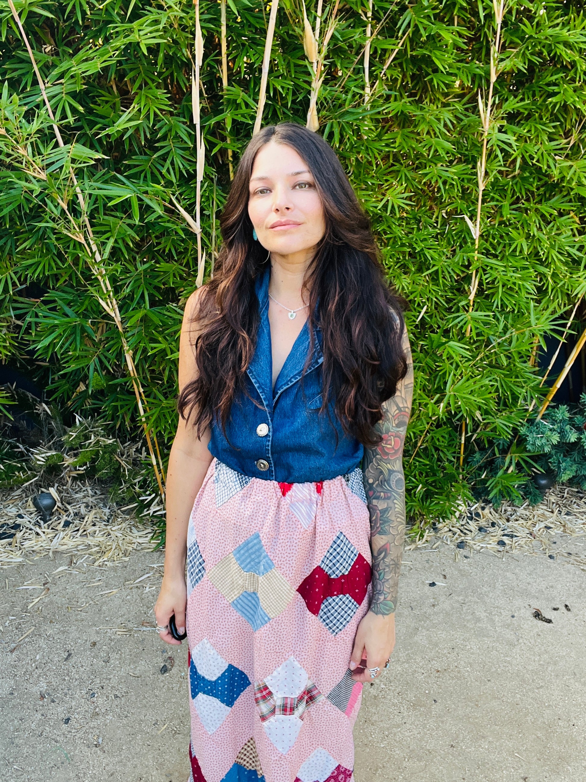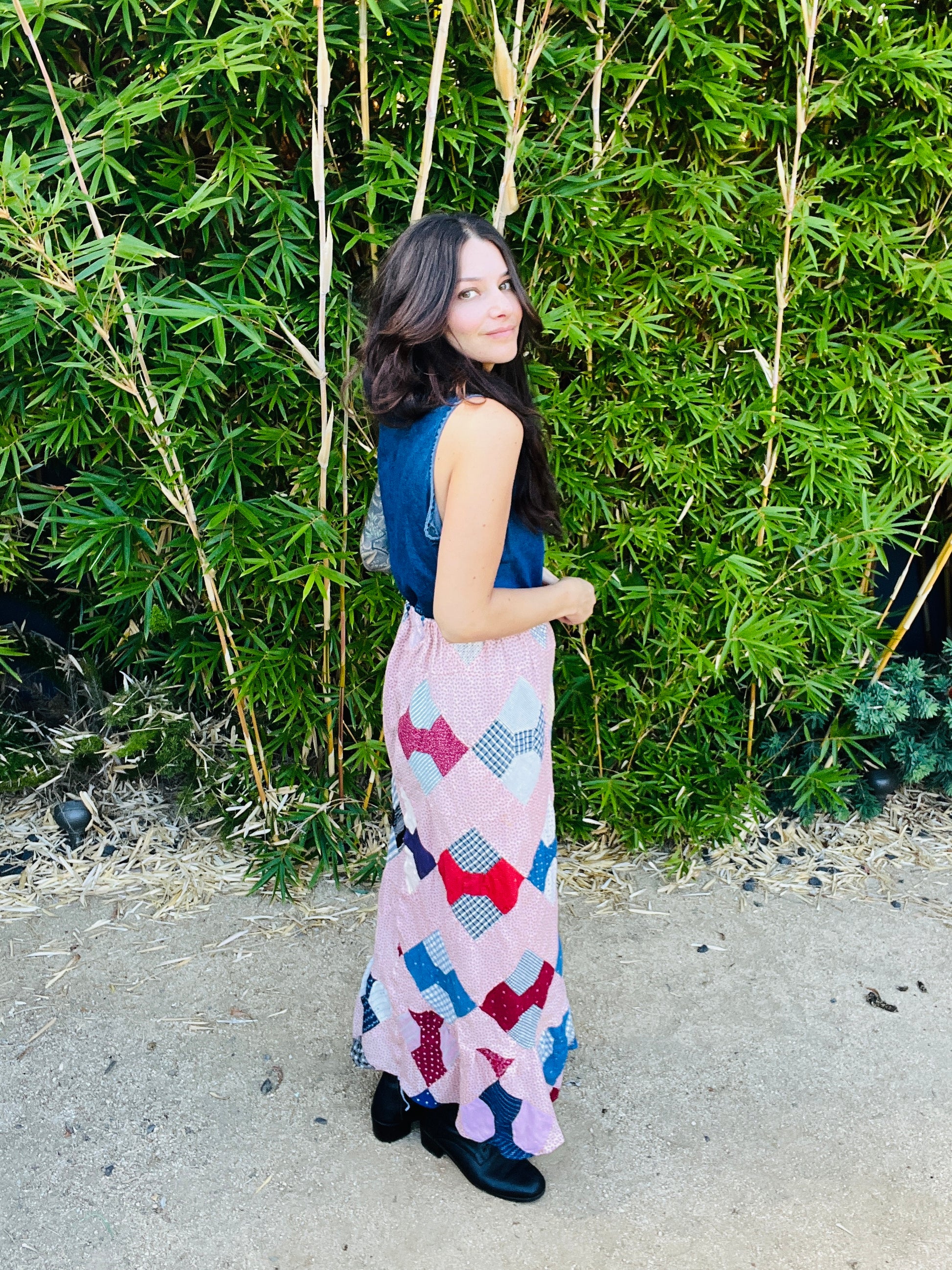 Handmade from an authentic 1940s quilt featuring shades of red, blush, and soft blues. Each patch is unique, giving this one-of-a-kind skirt a timeless, heirloom feel.