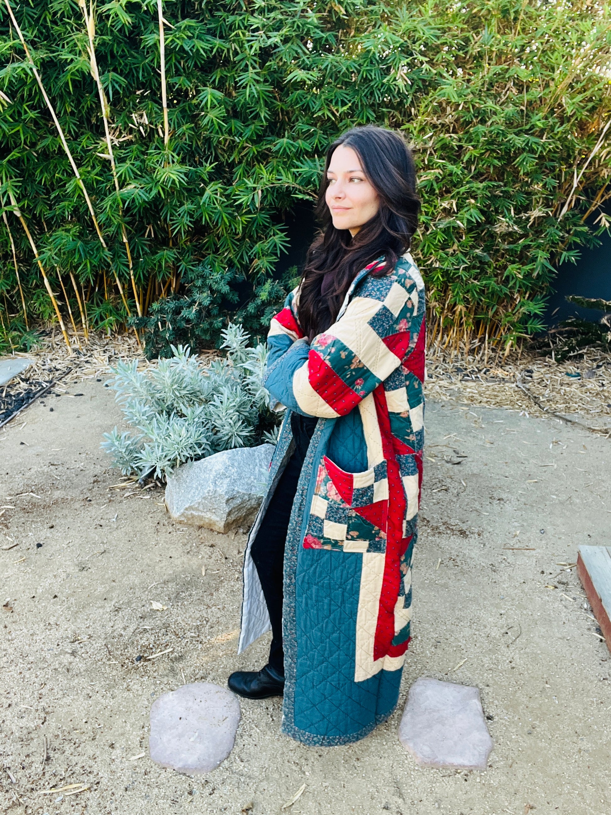 Handmade from an original 1950s quilt in deep teal, cream, red, and floral patchwork. This long duster-style coat features front pockets, full lining, and a relaxed open fit. Each piece is one of a kind and made from reclaimed vintage textiles.