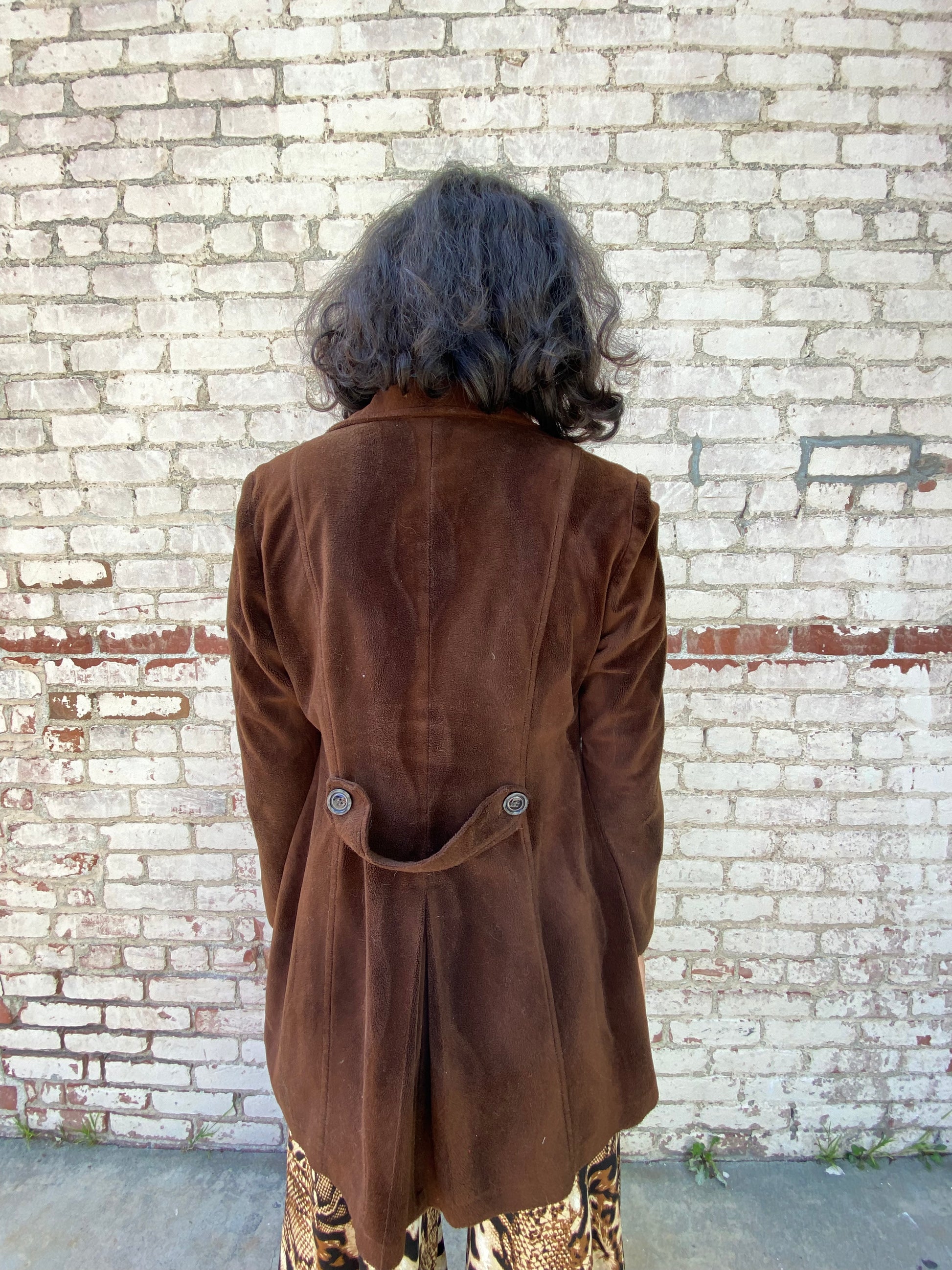 A stunning 1970s brown coat with a structured double-breasted front and cinched back detail with buttons. The perfect mix of timeless and romantic, this piece drapes beautifully and pairs effortlessly with vintage denim, wide-leg trousers, or flowing skirts.