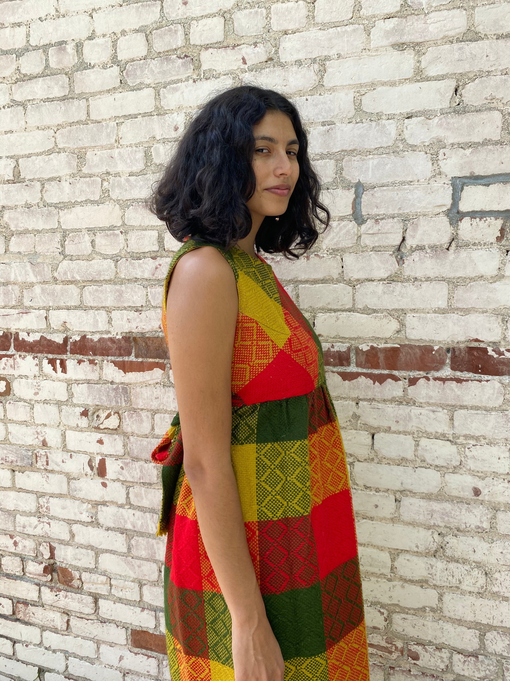 A true vintage statement piece; this 1970s sleeveless maxi dress features a plaid pattern in autumn tones of mustard, forest green, and brick red with intricate woven texture throughout. Cinched waist with a tie-back bow for a flattering, easy fit. Perfect for fall markets, dinner parties, or everyday wear.