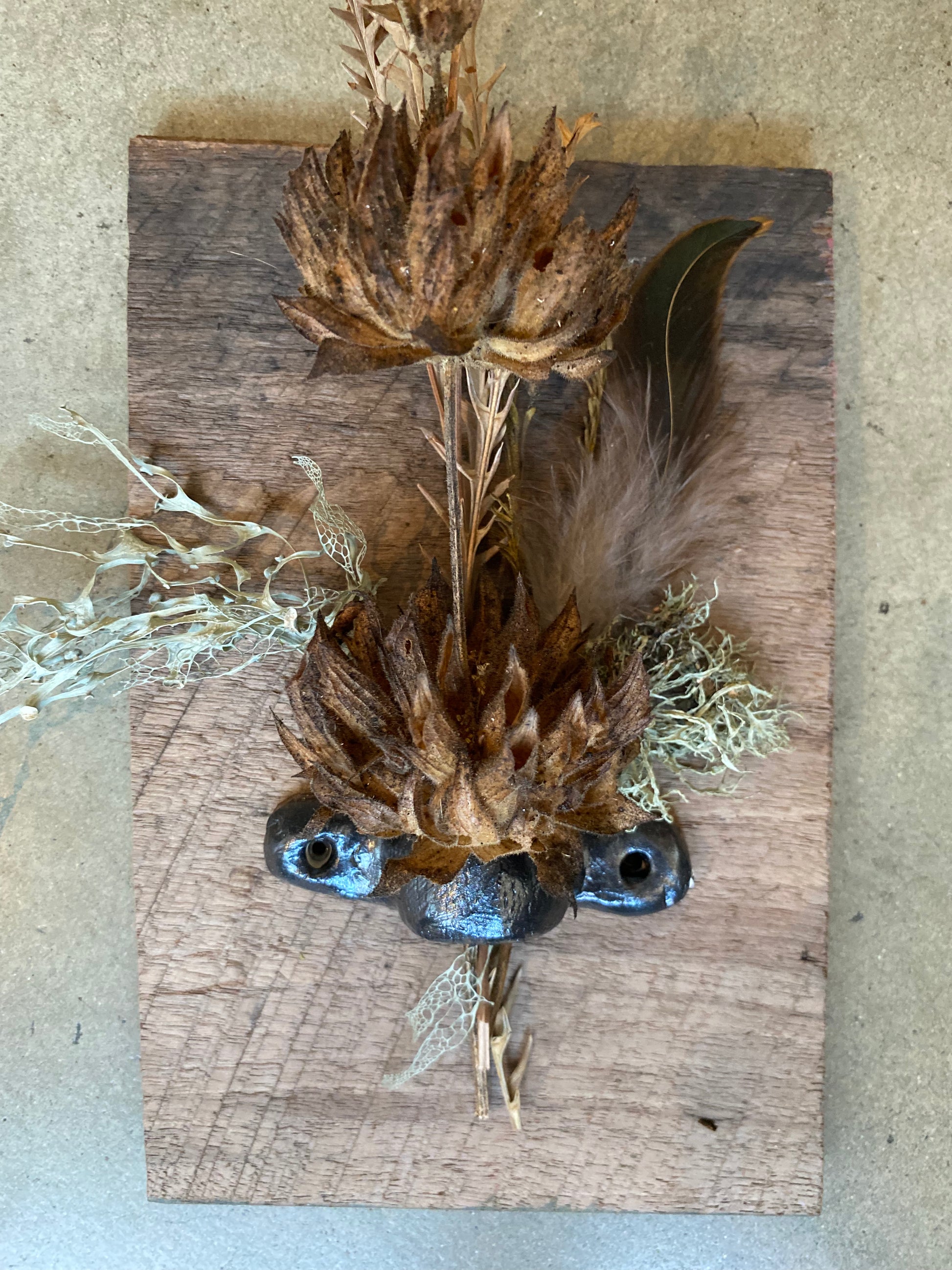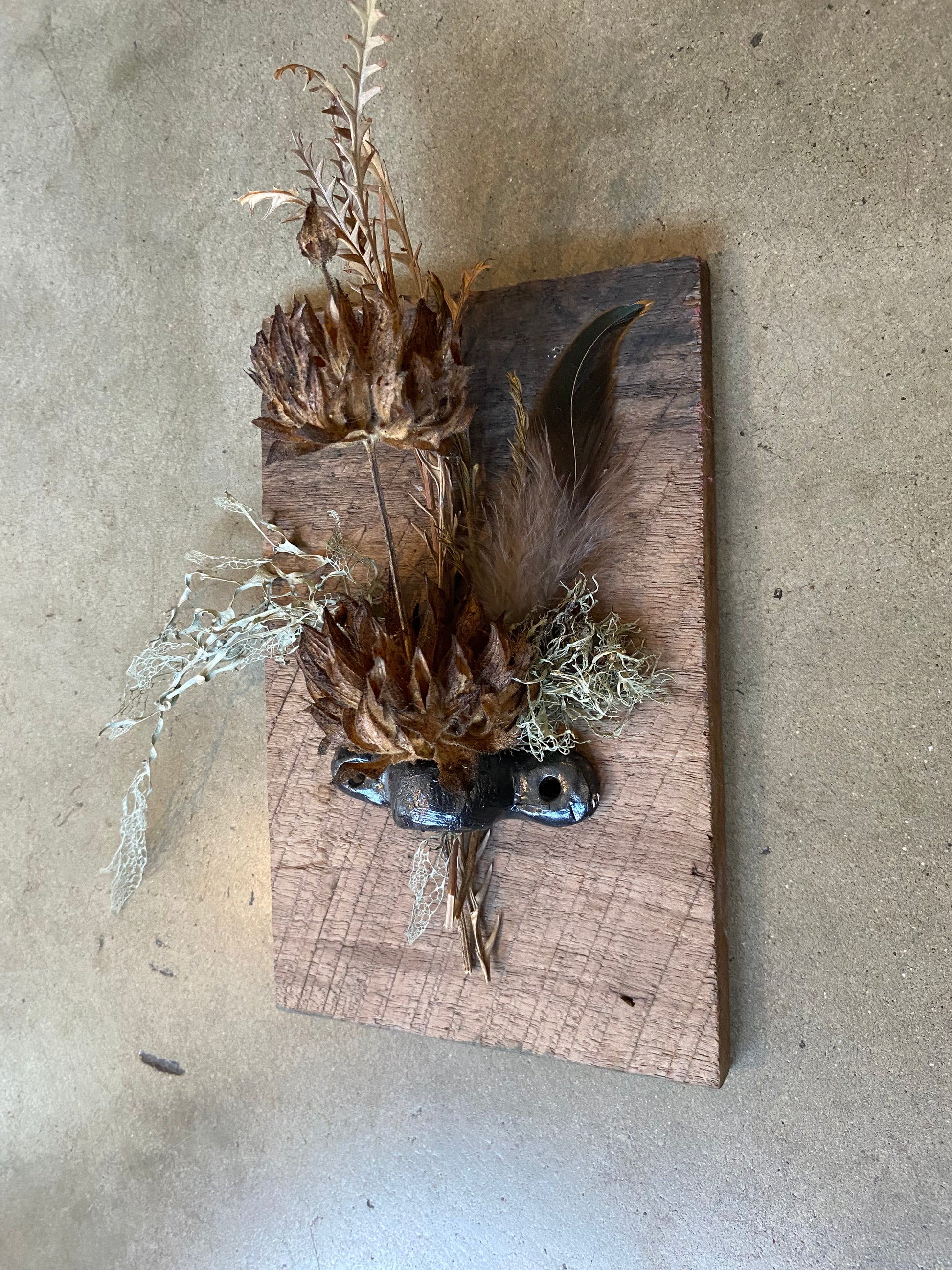 A one-of-a-kind piece created with dried botanicals, moss, and feather, arranged on reclaimed wood. Each element is naturally foraged and assembled to highlight earthy texture and organic form.