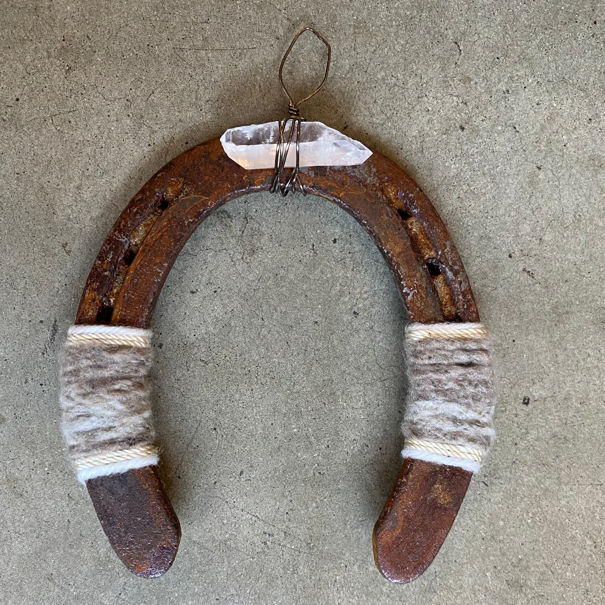 • Materials: vintage horseshoe, raw quartz crystal, copper wire, assorted leather + yarn or hide