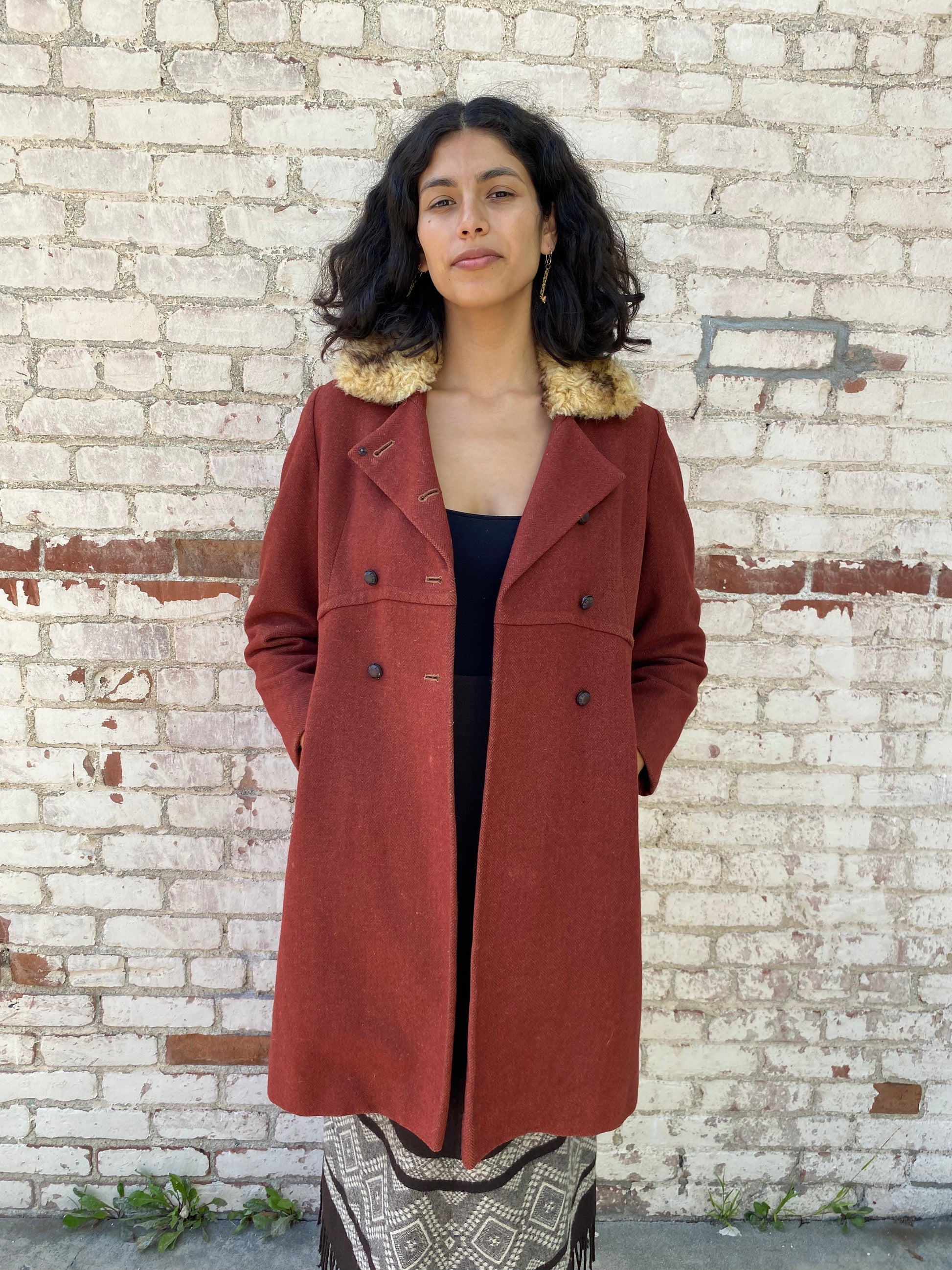 A beautifully tailored rust-toned wool coat featuring a soft faux fur collar and a double-breasted front. This 1970s classic brings warmth and polish in equal measure; the structured shape and rich hue make it a perfect piece for the colder months.