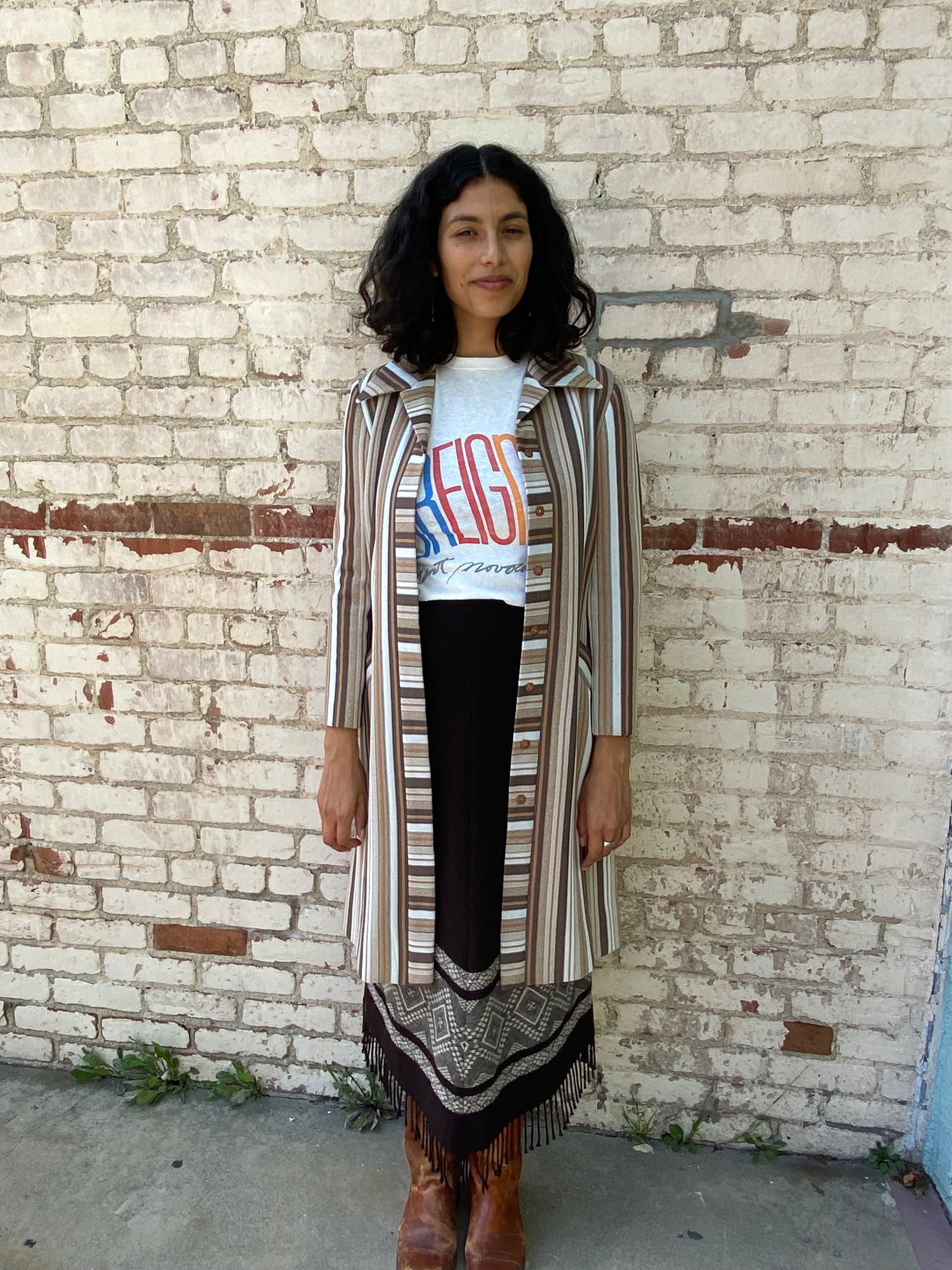 A stunning vintage 1970s striped coat in shades of tan, cream, and soft brown. Features a wide 70s collar, front buttons, and side pockets. Lightweight and perfectly tailored for layering through fall; the kind of piece that makes any outfit feel intentional.