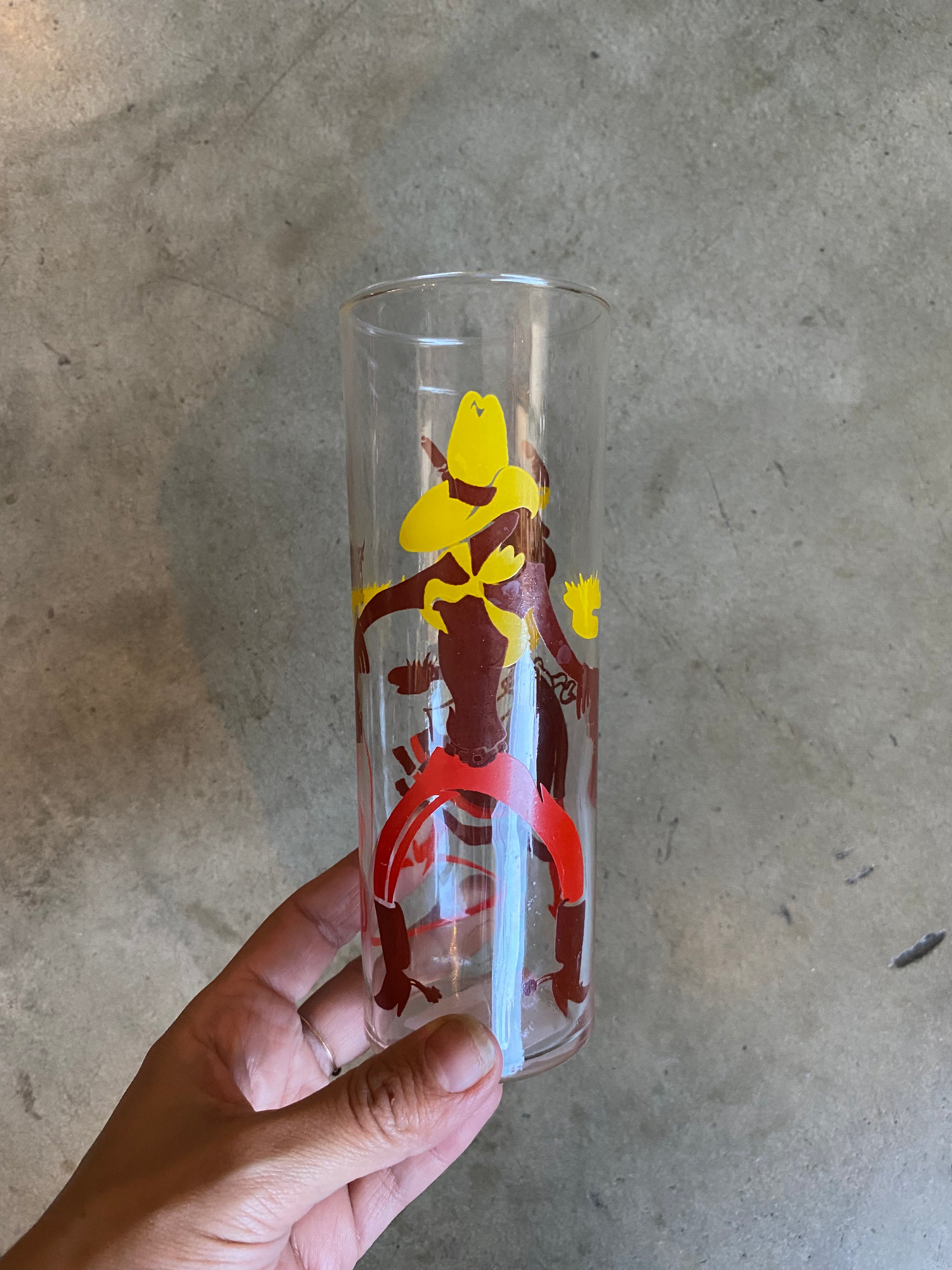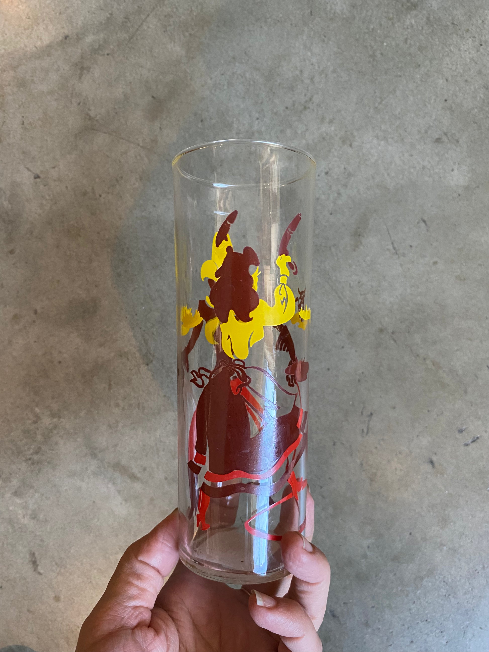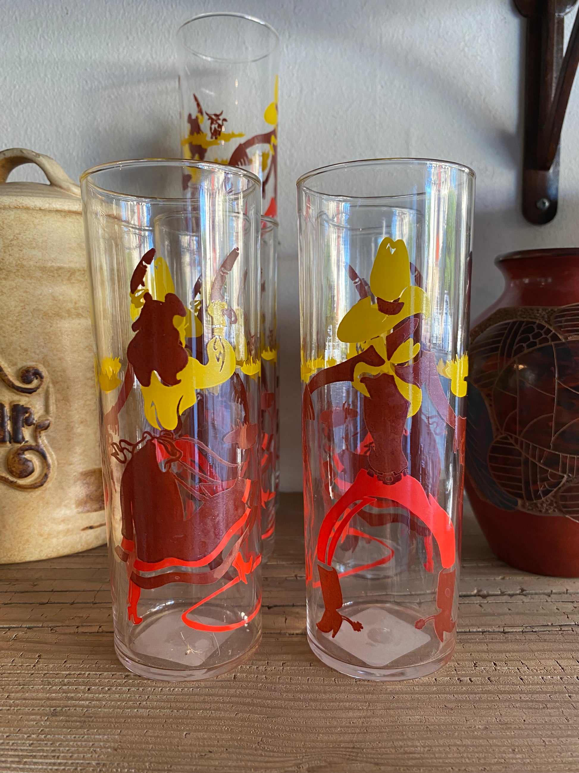Add a touch of western charm to your bar cart or kitchen shelf with this playful vintage glassware set. Each tall glass features a bold cowboy and cowgirl dancing motif in mustard yellow, burnt orange, and deep red tones; a nod to midcentury Americana design. The detailed graphics wrap around the glass, creating a lively motion effect that makes them as fun to display as they are to sip from.